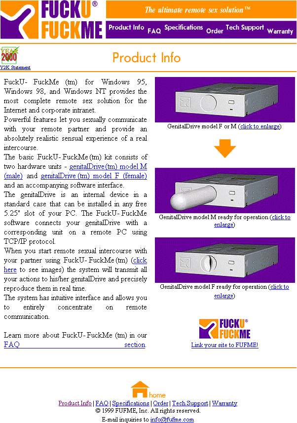 Già che siamo in vena di amarcord... i veeeekki iscritti alla niusletter ricorderanno il FUFME ("fuck u fuck me"), cioè il dispositivo che negli anni 90 permetteva di chiavare FISICAMENTE su INTERNET...