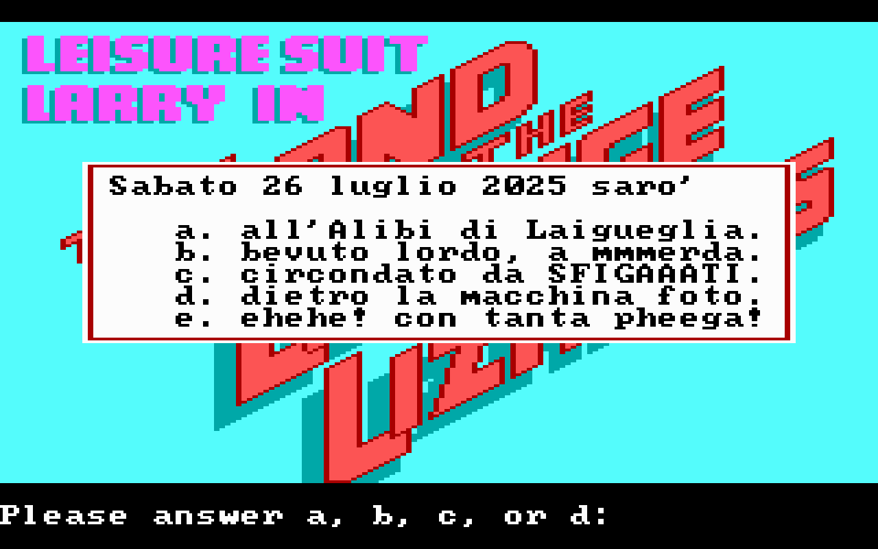 Ma certo, siamo nel LUGLIO 2025!!! Figata!!! Vi rendete conto? Siamo ufficialmente più vicini al 2050 che al 2000. Siamo più lontani dal 2000 di quanto lo era il 1975 nel 2000! E io, martedì 22/7 (cioè 3 e 14) faccio 50 anni!!! Yeeee!!! Sabato 26 organizzo una festa all'Alibi di Laigueglia, segnatevelo! Ci sarà musica prog con i Band Pensanti, tempi dispari per la mia cifra tonda, GRATIS! Fatemi sapere se venite, ché vi riservo le sedie, se no rischiate di finire in mezzo alla pheega! E, dite la verità, vi siete iscritti solo perché vi faccio sentire normali! Eh?