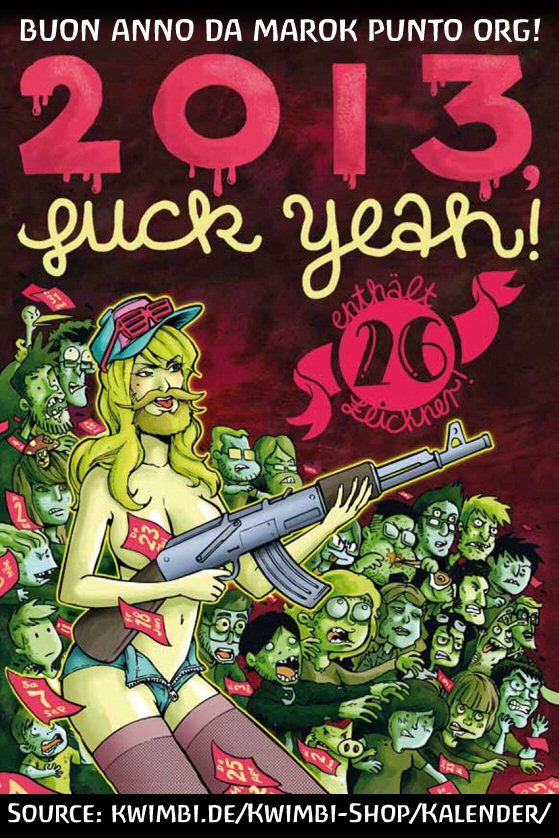 Io l'ho trovato divertente... è stato un anno di salute, letteratura, viaggi, cultura, poesia, avventura, tecnologia e catastrofi naturali! È stato l'anno dello SBIANCAMENTO ANALE, dei 18 libri di ALAN MAGNETTI, del PercFest sulla BAVE, dei fumetti di ZEROCALCARE, di LIVORNO provincia di PISA, della FINE DEL MONDO (o, come dicono i Maya, di quella parte del mondo in cui non ci sono Buddisti e non è passato il Sacro Graal), delle sigarette elettroniche che puzzano ma non si può dire se no blablablablà gnegnegnegné... e, soprattutto, di WINDOWS 8: