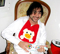 Al collo aveva un bavaglio con la faccia di un maiale, in mano custodiva una chitarra giocattolo ed era già completamente ubriaco.