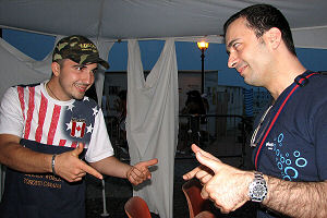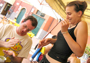 Verso le cinque fu l'ora di montare il banchetto in piazza e Massimo si era già prontamente dileguato per vedere il seminario di Ellade. In compenso, avevamo due clienti d'eccezione: Ilaria e SNAFU. Vagavano per il budello con aria spersa e smarrita, così li invitammo a cazzeggiare con noi.