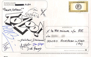 Tra le tante, vale la pena ricordare le CINQUE cartoline IDENTICHE da spedire ai CINQUE io di Alan Magnetti: erano uguali in tutto e per tutto, anche nelle firme. Cambiava solo il nome del destinatario, che terminava con un contatore da 1 a 5.