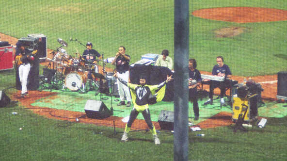 Ottima l'acustica (contro ogni previsione, in un posto del genere!) e bello l'immenso palco che, virtualmente, si estendeva per tutto il campo da gioco: era un'immensa tovaglia verde che dava modo a Mangoni di apparecchiare le sue cazzate per tutto lo stadio, nonché di arrampicarsi sulla rete e farla vacillare, con la sua grazia da pachiderma claudicante, però sempre sexy.